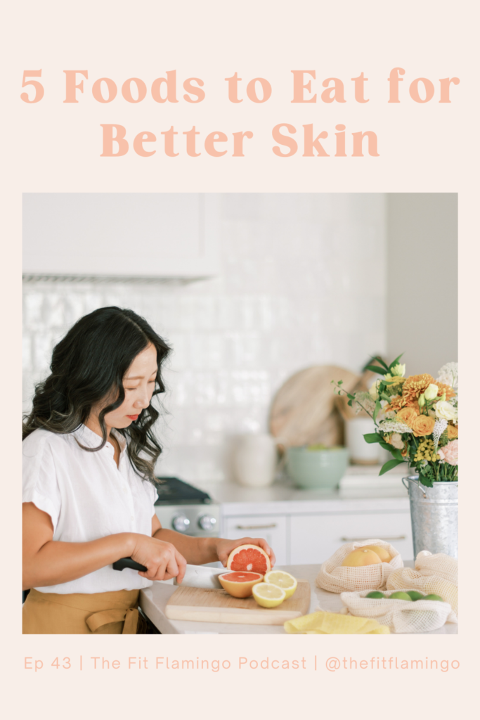Hey friend, welcome to The Fit Flamingo Podcast. In this episode, I share 5 foods to eat for better skin. My favorite thing about this topic is that when you focus on incorporating more of these 5 foods into your diet, your gut health and overall health improves too.